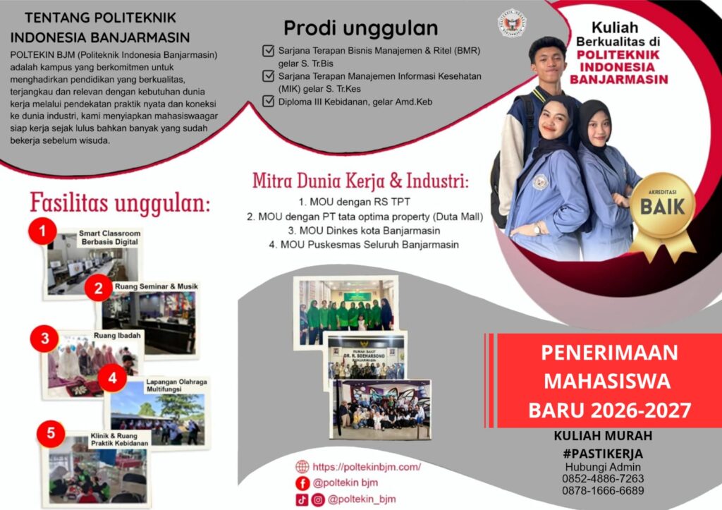 POLTEKIN BJM (Politeknik Indonesia Banjarmasin) adalah kampus yang berkomitmen untuk menghadirkan pendidikan berkualitas, terjangkau, dan relevan dengan kebutuhan dunia kerja.